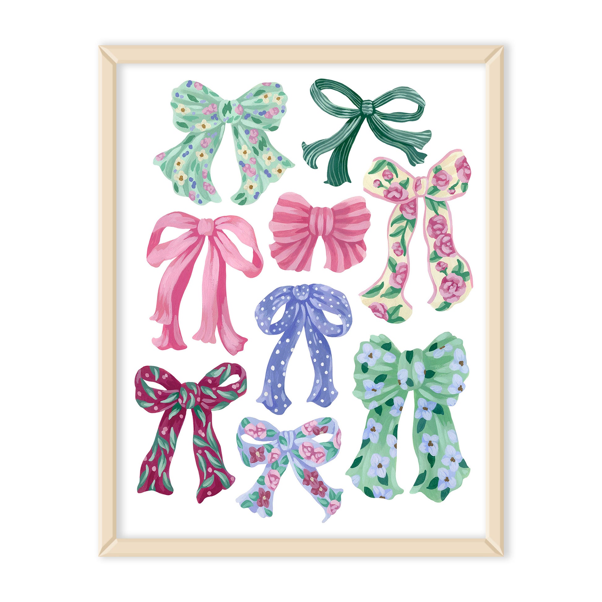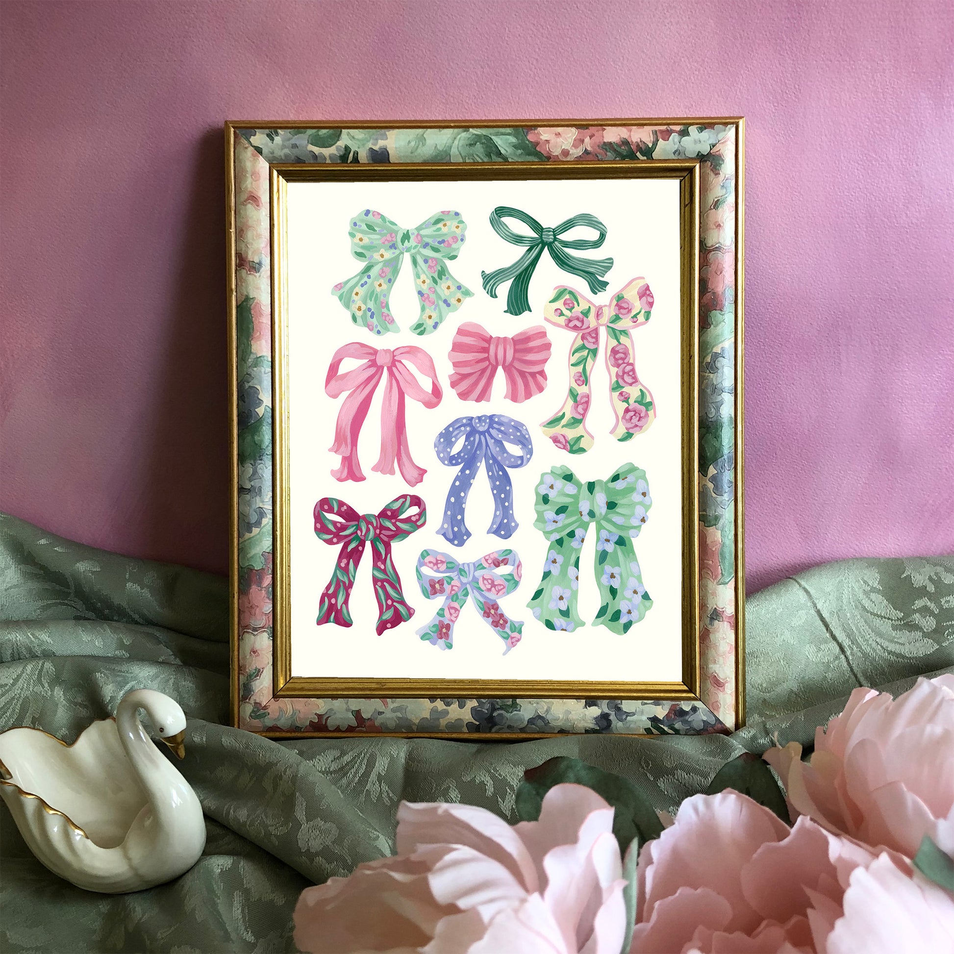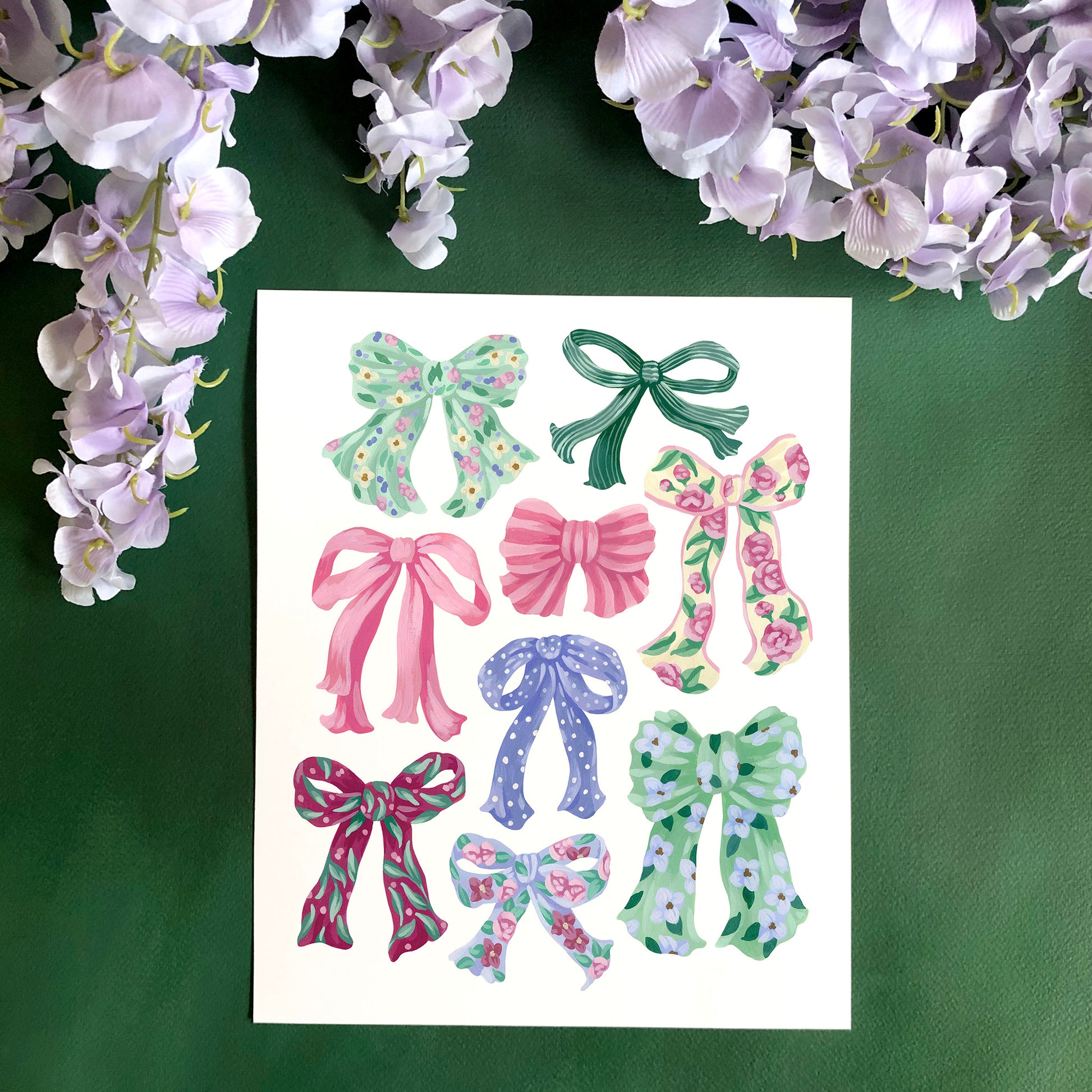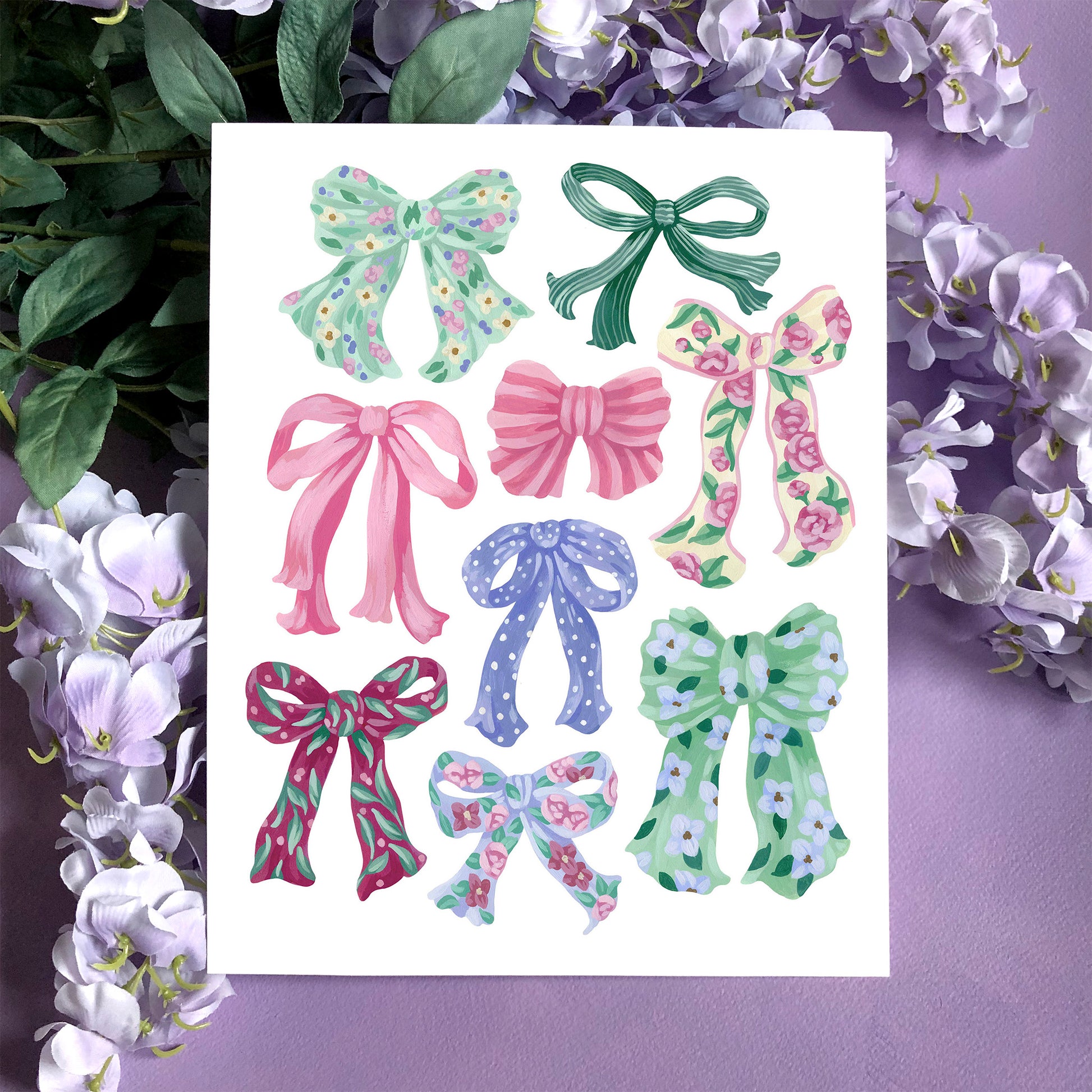 This colorful bow art print features an original design by artist Mia Whittemore. Perfect for adding a touch of the romantic coquette aesthetic to your space, this print showcases a collection of charming hand-painted bows on a white background.