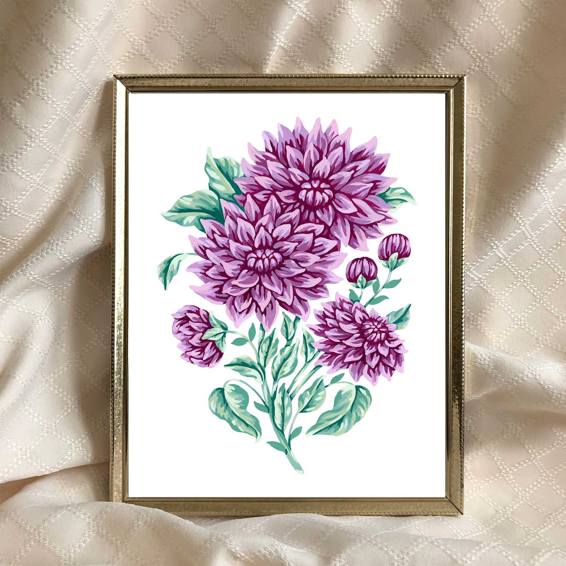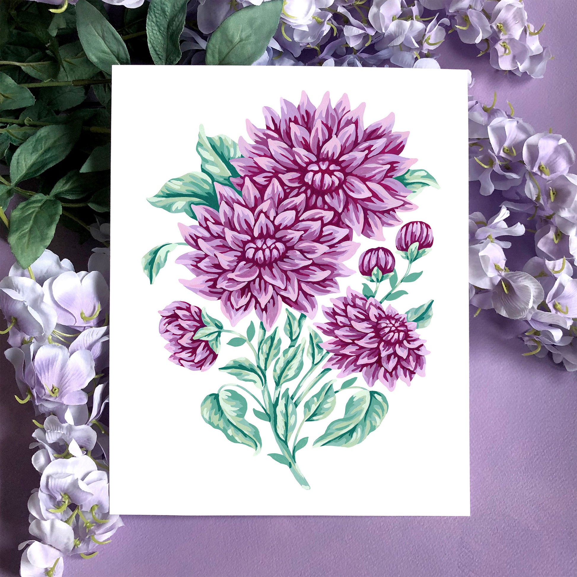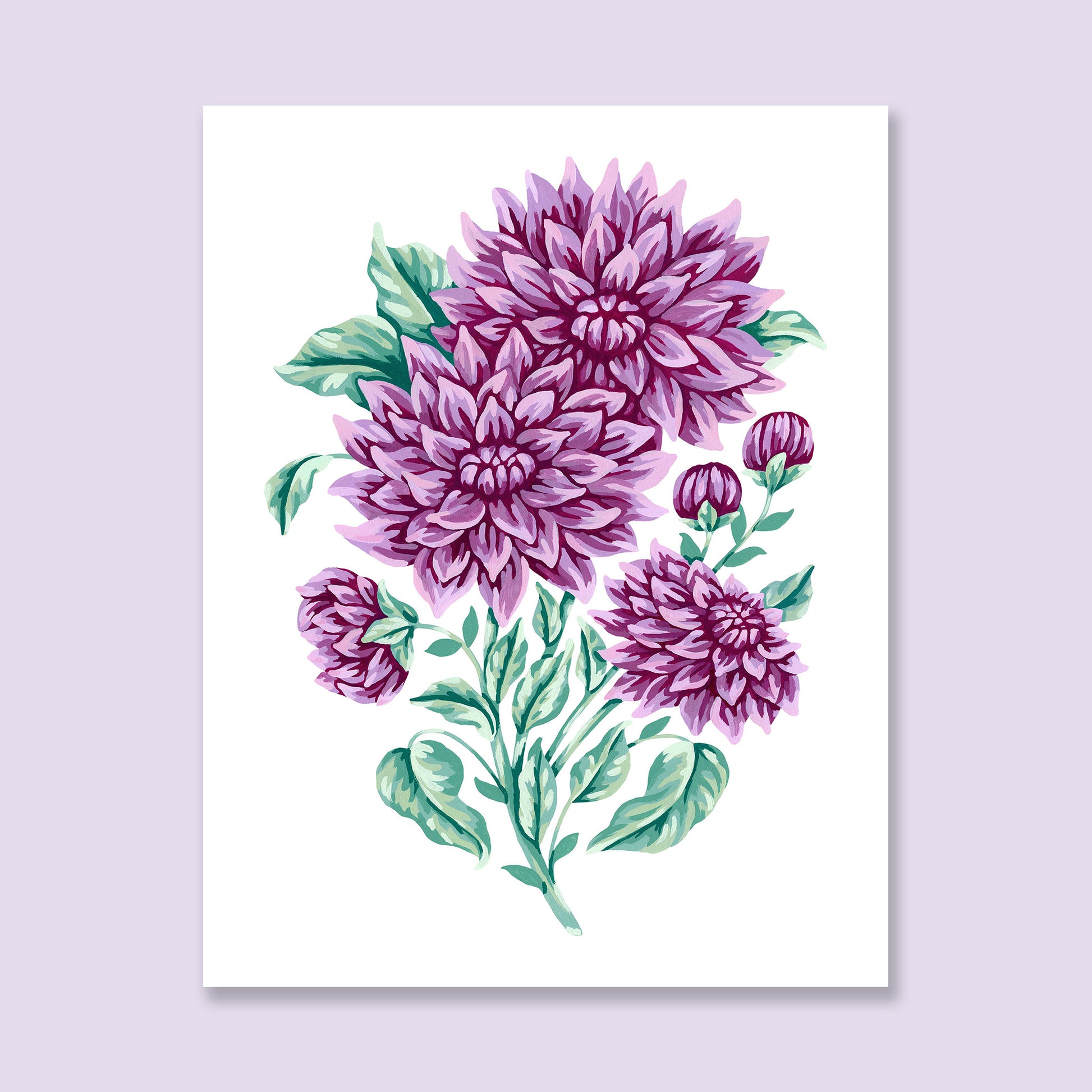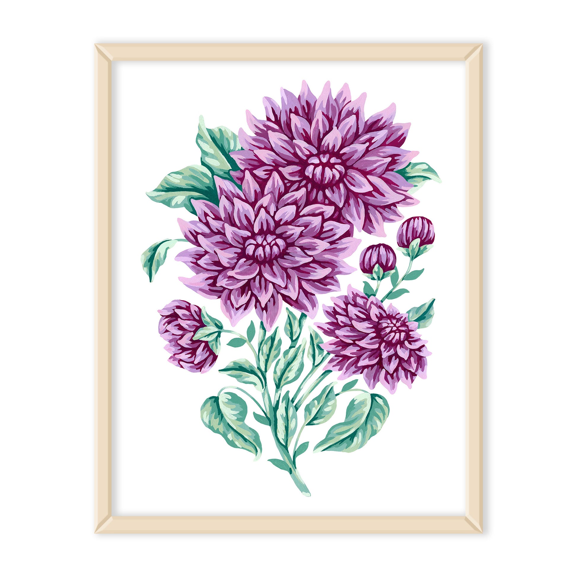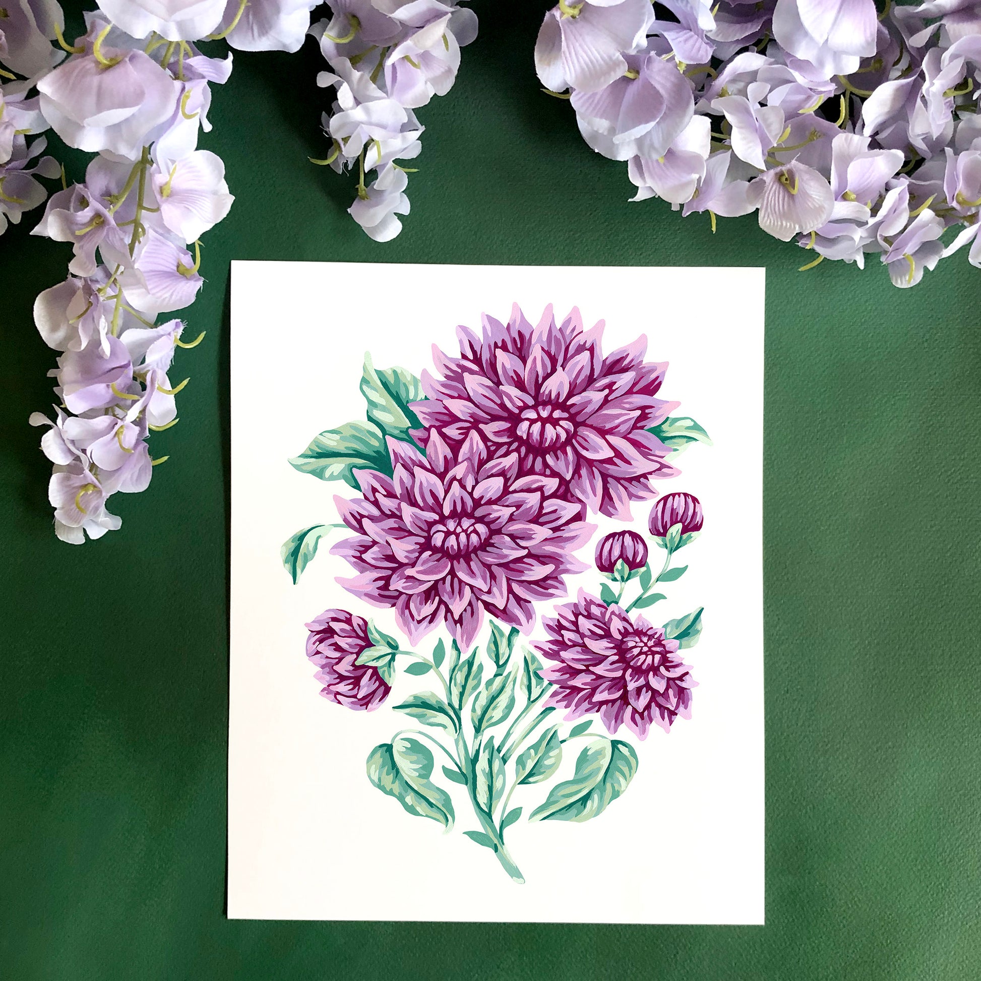 Drawing inspiration from the classic charm of vintage botanical posters, this dahlia flower art print of Mia's original acrylic gouache artwork features a purple dahlia in bloom. This vibrant floral illustration on a white background is lovely on its own or complemented by Mia's other floral prints such as her Hydrangea or Peony.