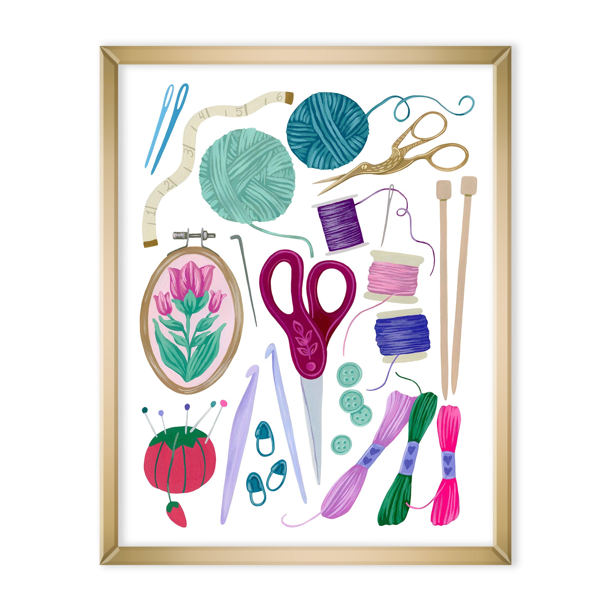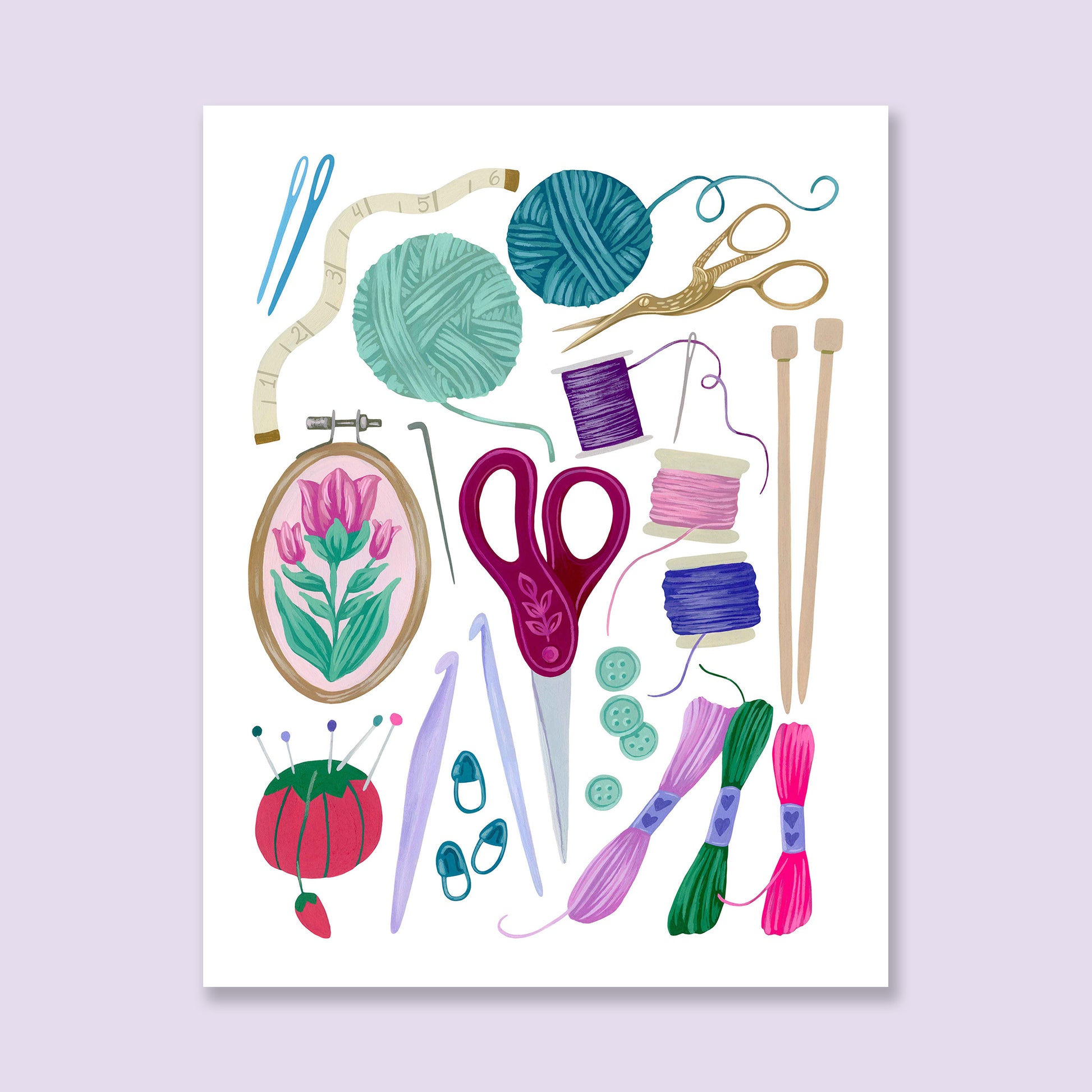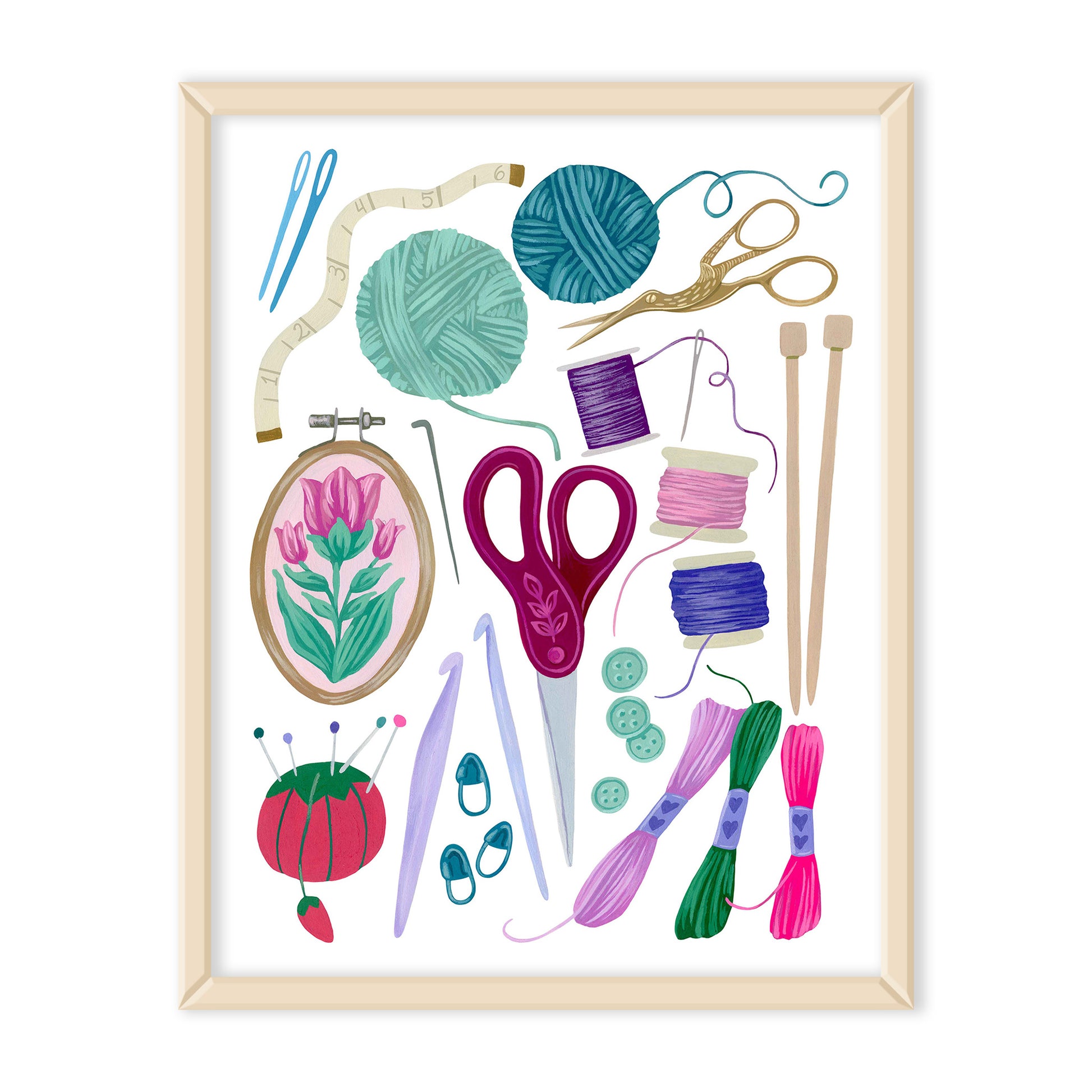 This fiber art supplies print of an original artwork by artist Mia Whittemore features a collection of supplies used by fiber artists, from skeins of yarn and embroidery floss to gold stork scissors and knitting needles. The perfect addition to the walls of your craft room or a gift for the fiber artist in your life.