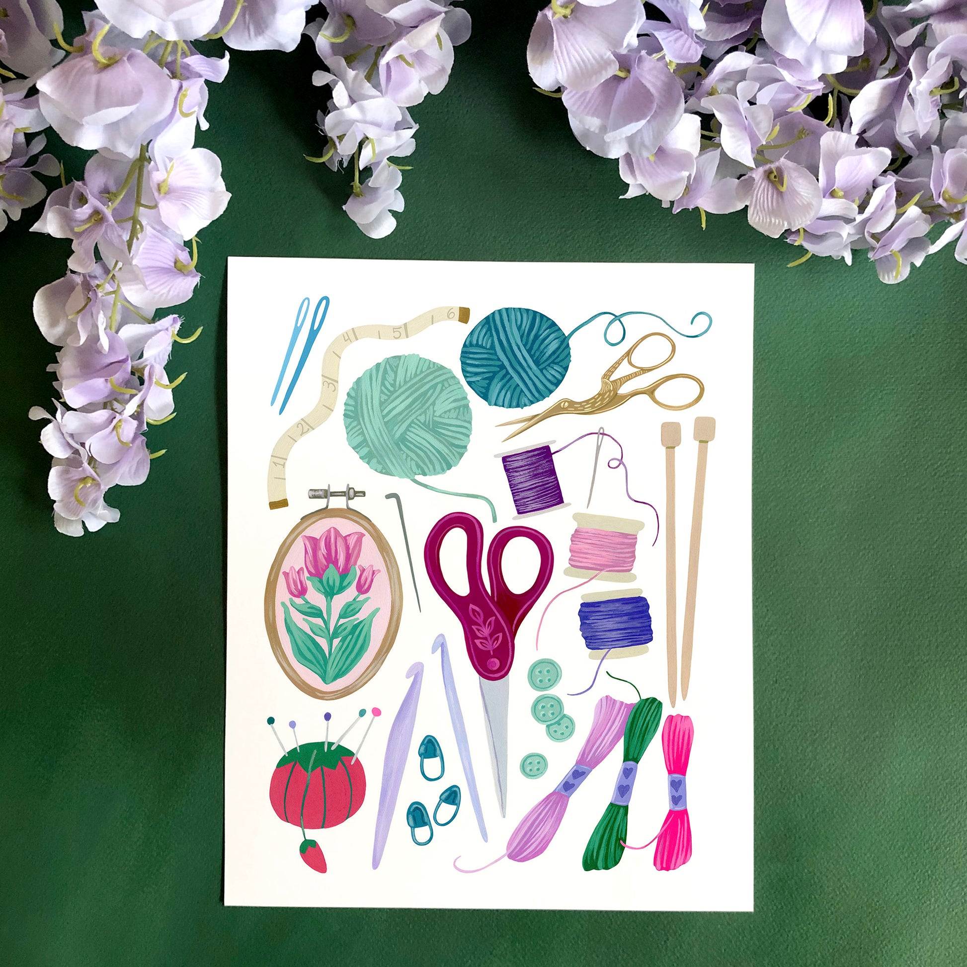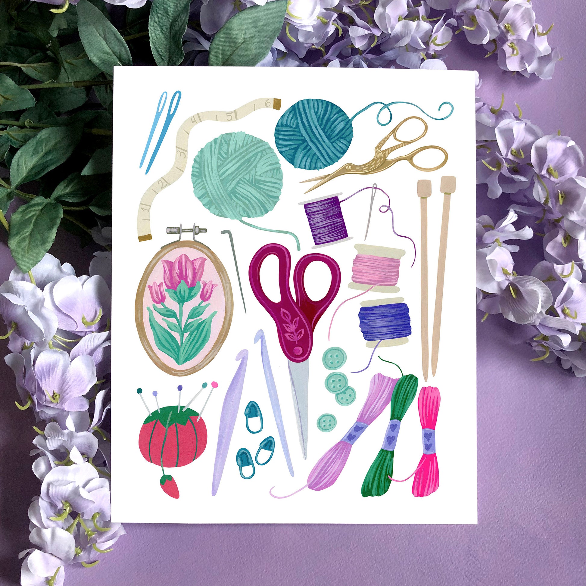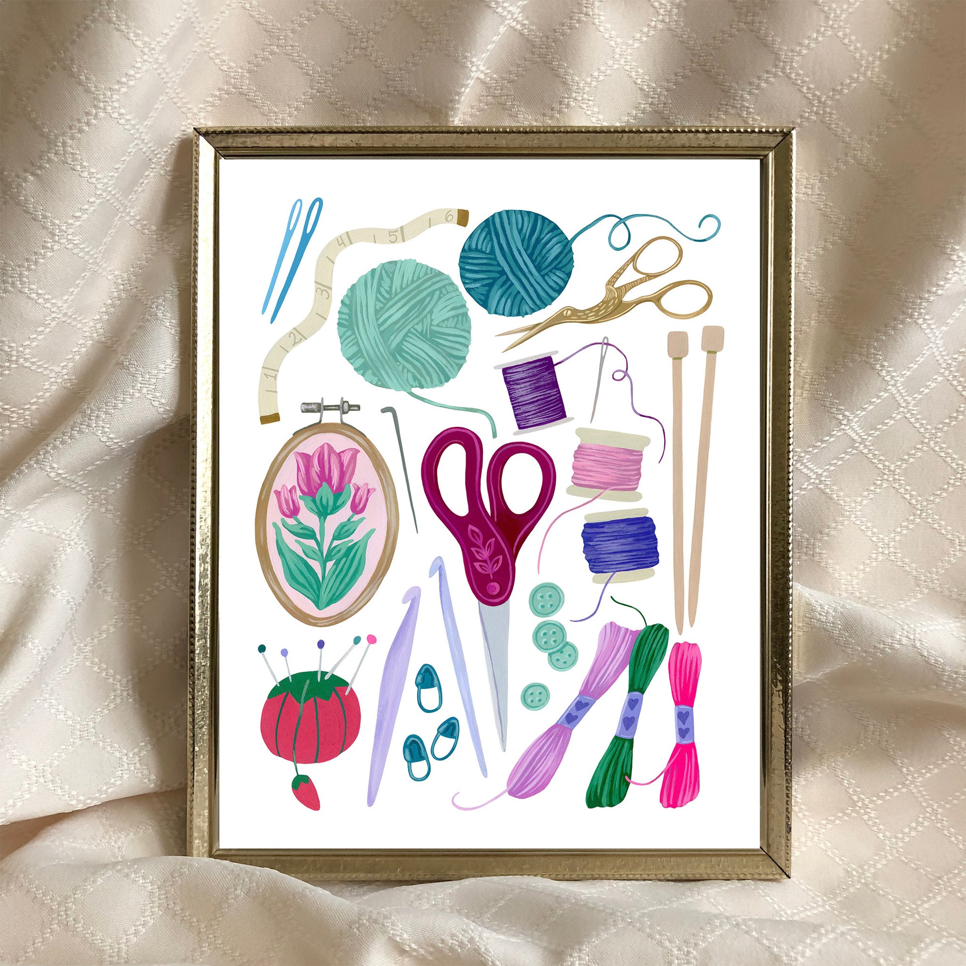 This fiber art supplies print of an original artwork by artist Mia Whittemore features a collection of supplies used by fiber artists, from skeins of yarn and embroidery floss to gold stork scissors and knitting needles. The perfect addition to the walls of your craft room or a gift for the fiber artist in your life.