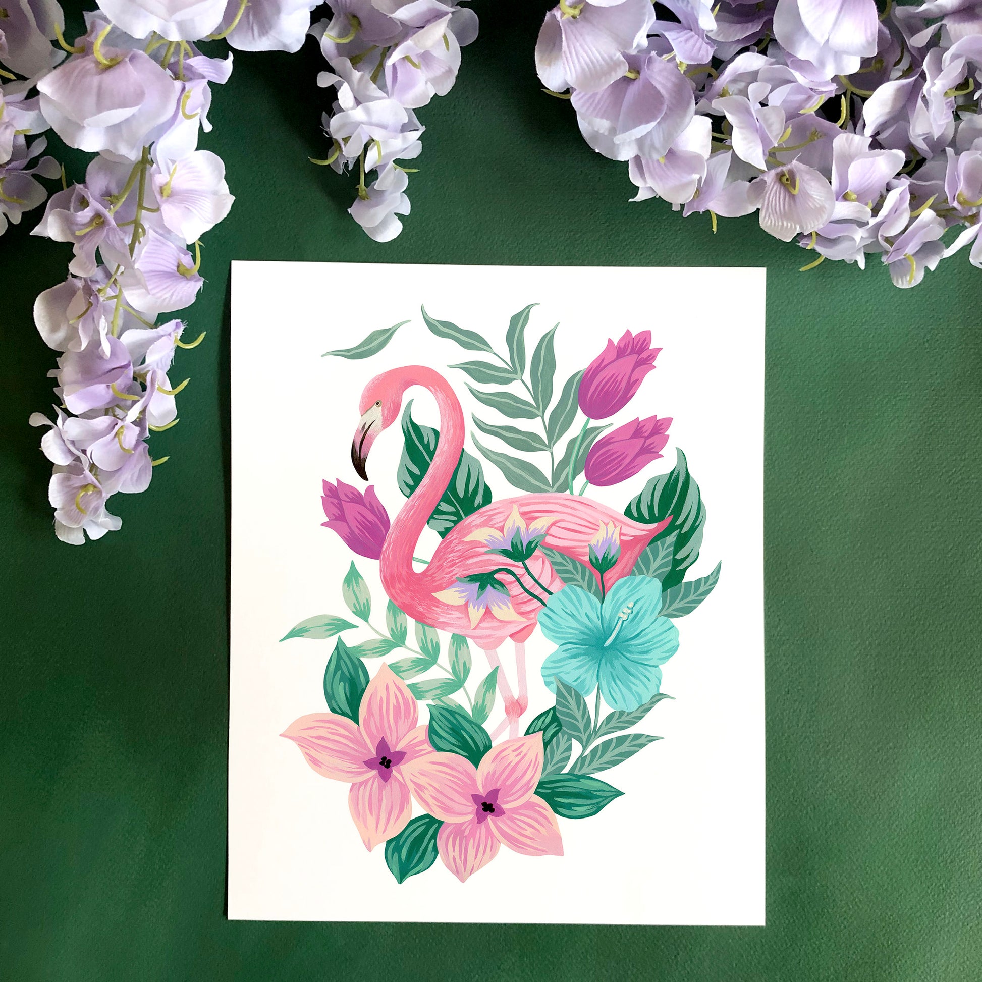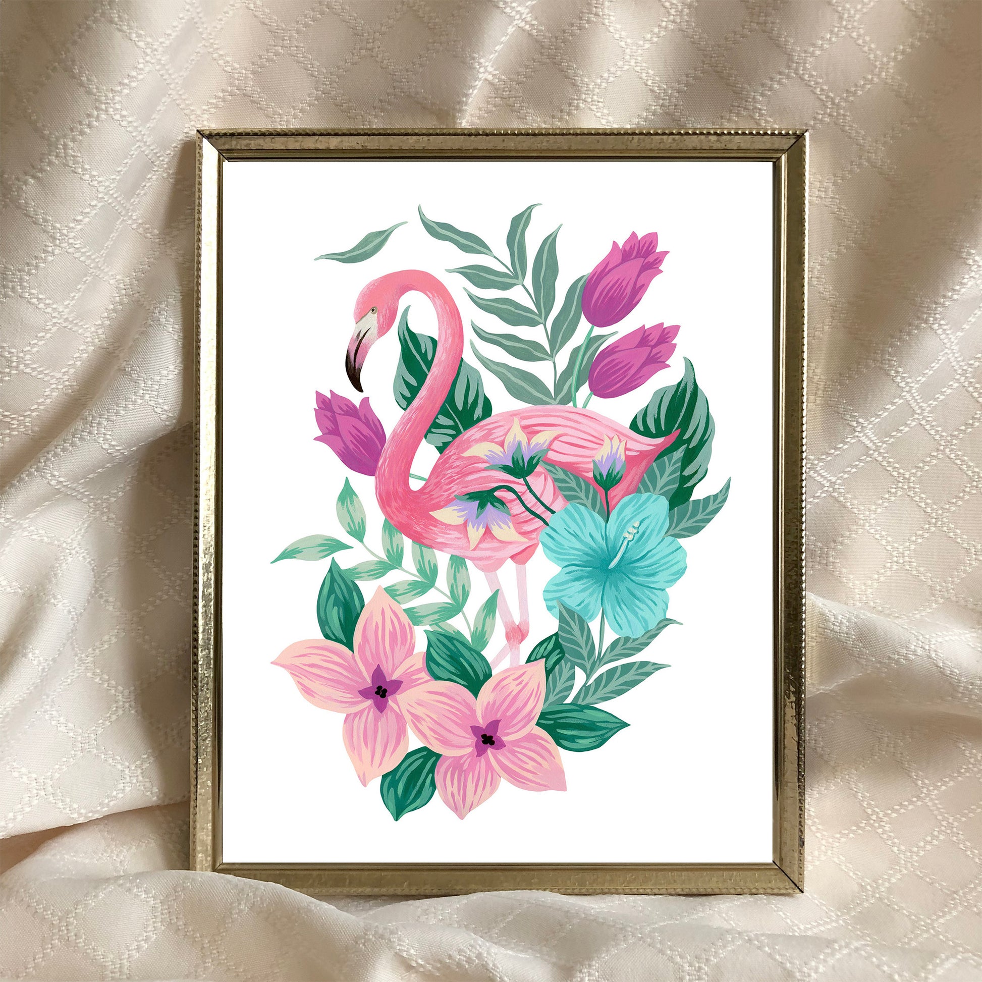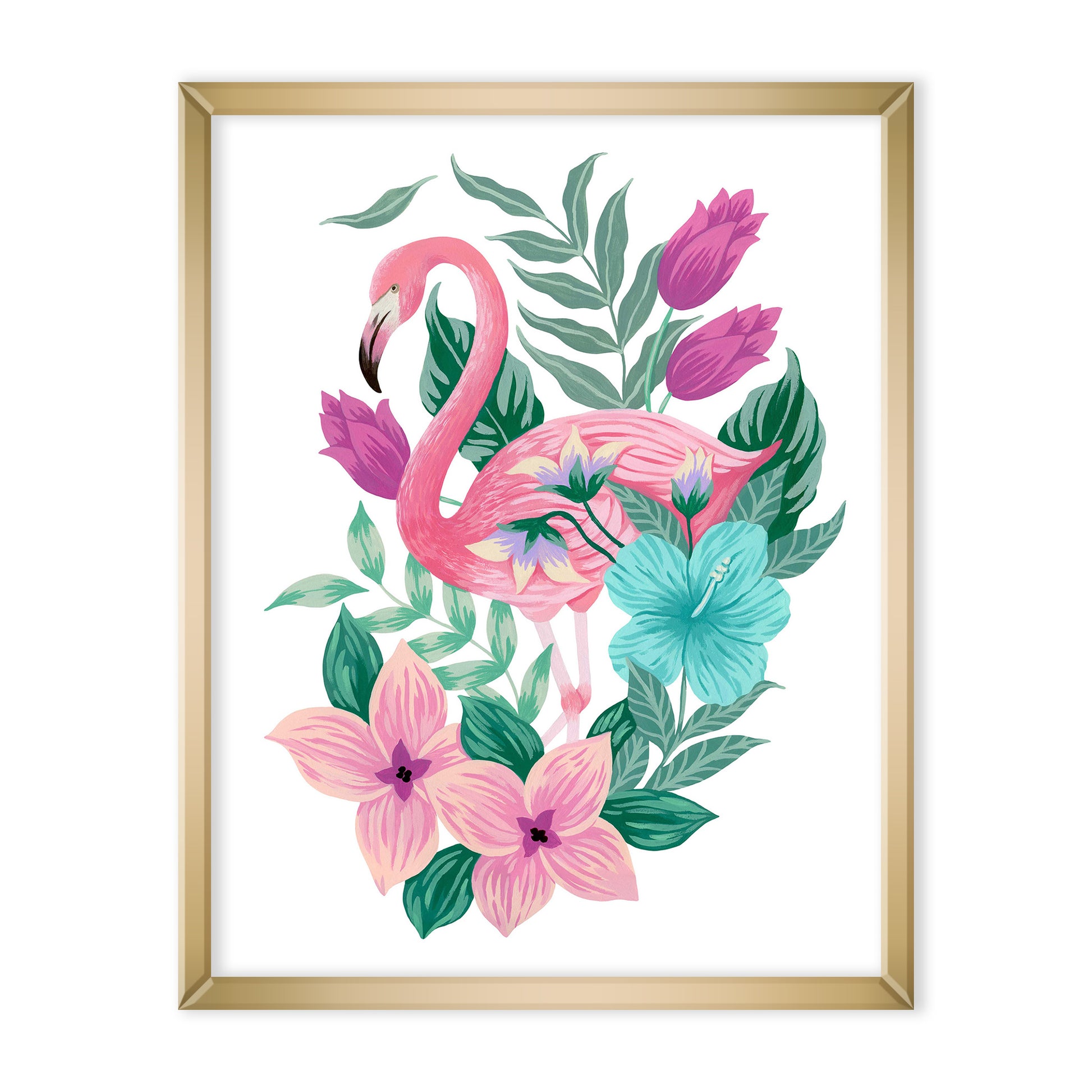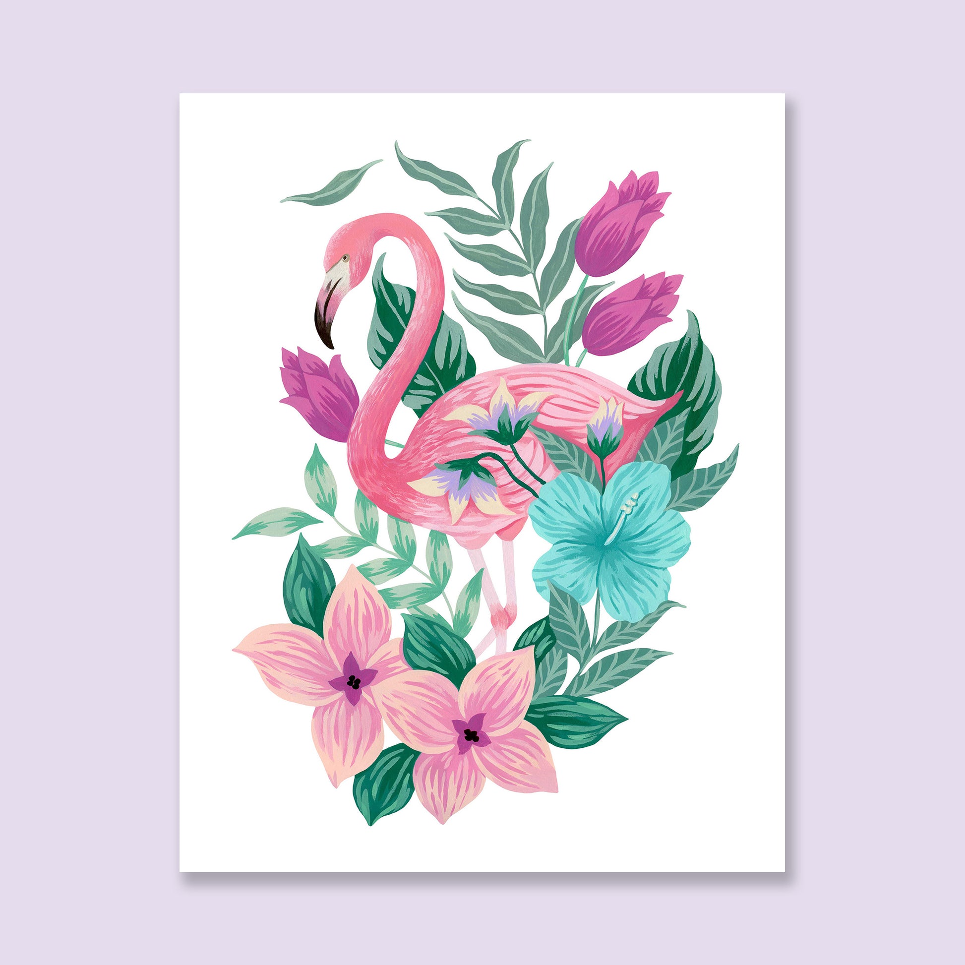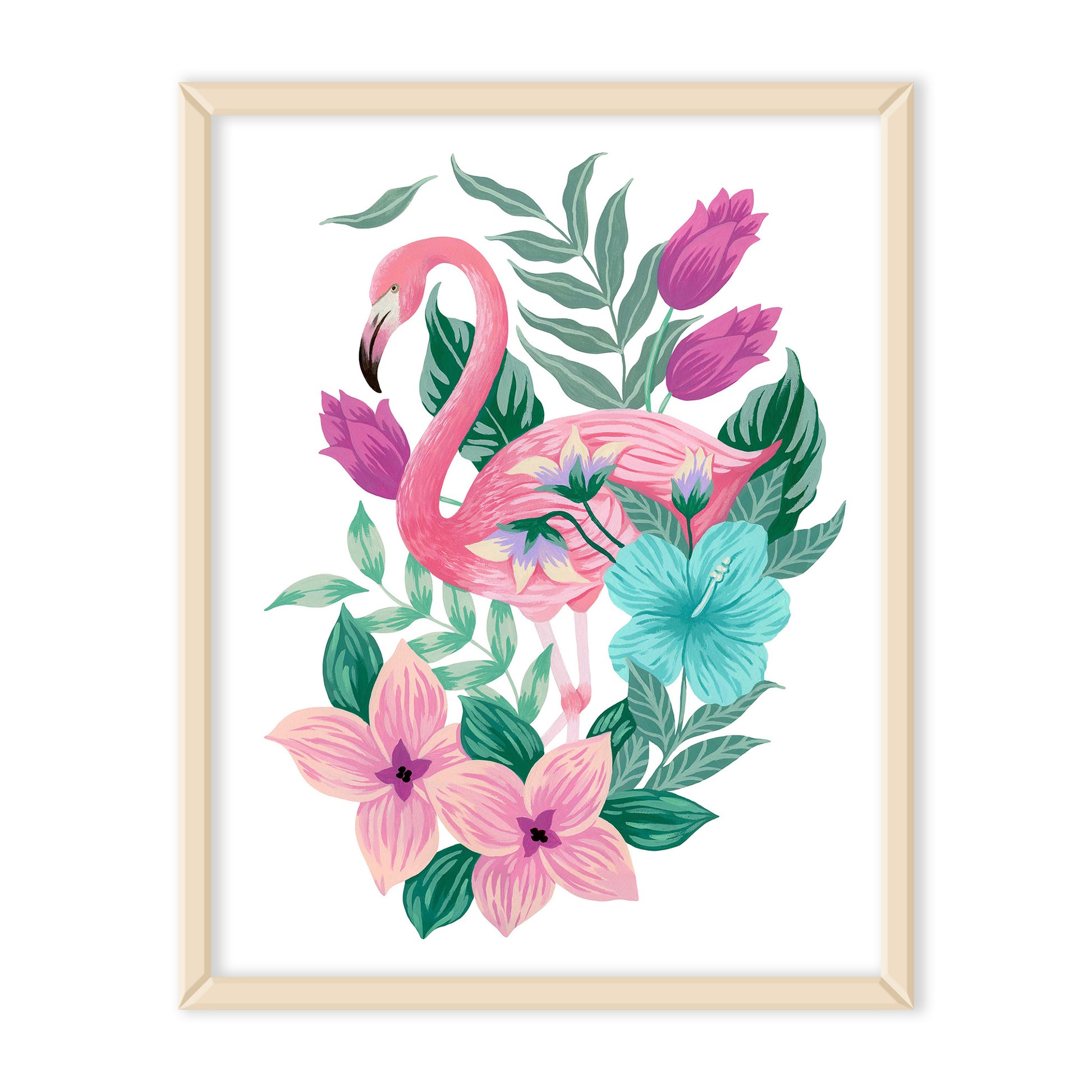Add a tropical touch to your home all year long with a flamingo themed floral artwork! This art print of Mia's original acrylic gouache artwork features a pink flamingo surrounded by tropical inspired flowers and plants on a white background.