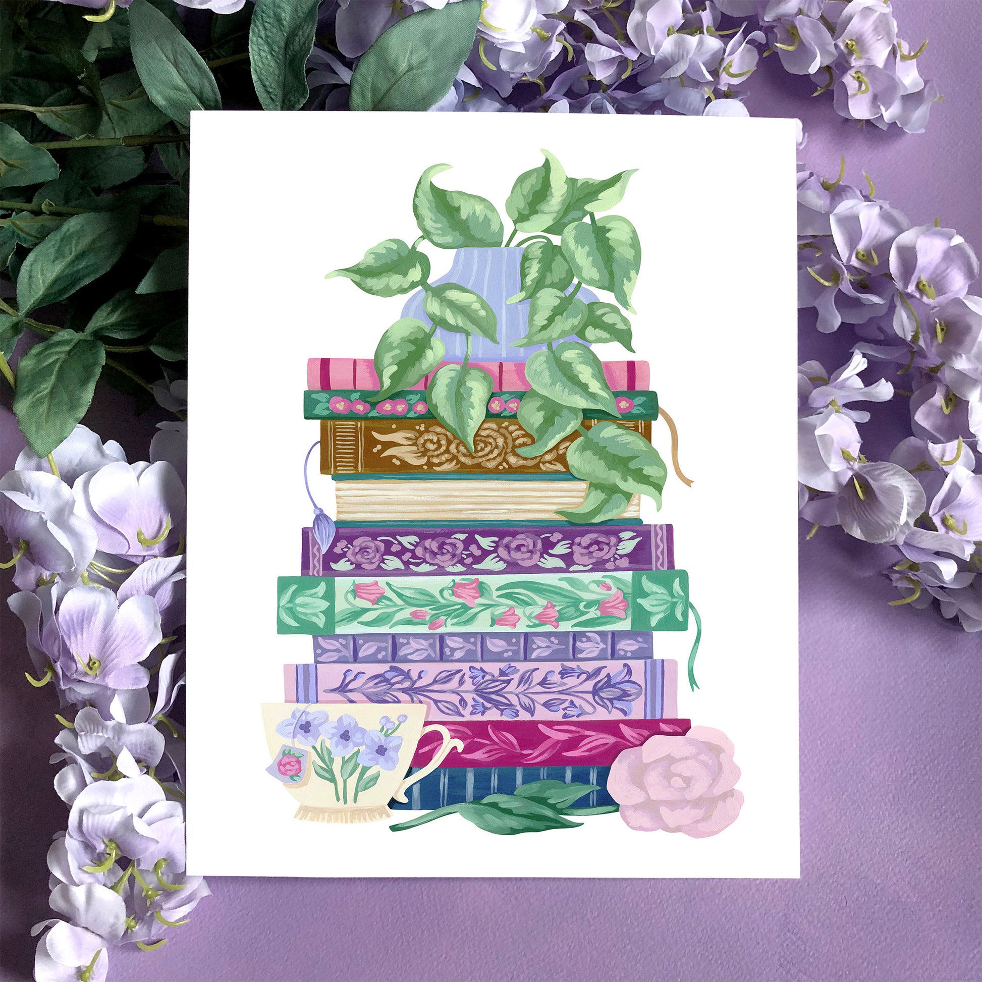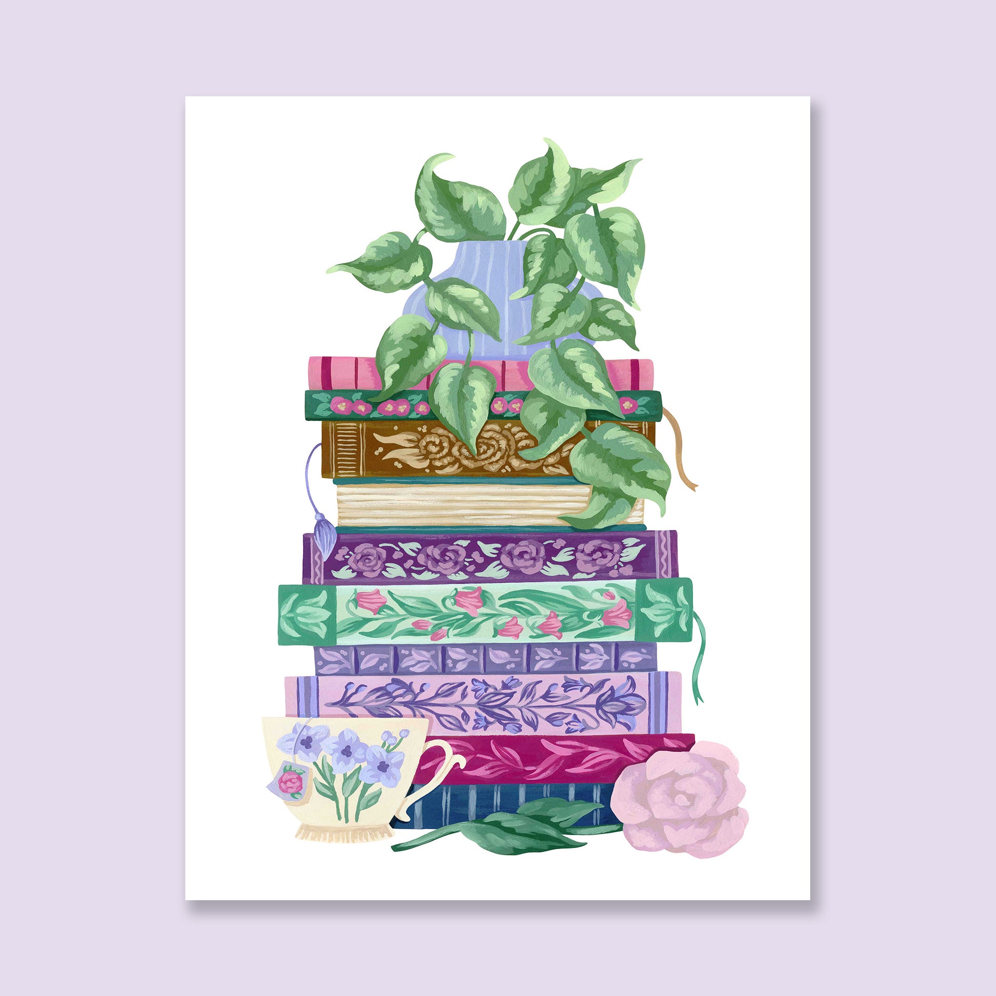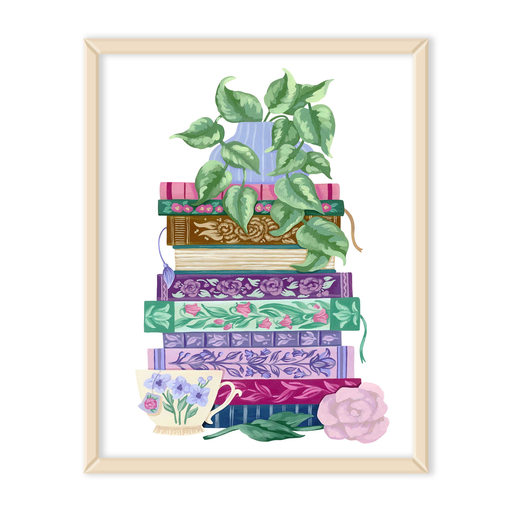 This floral stack of books art print features an original design by artist Mia Whittemore. A vase of trailing green leaves sits atop a stack of colorful and embellished books with a teacup and pink flower at the bottom. A perfect bookish gift for yourself or a friend!