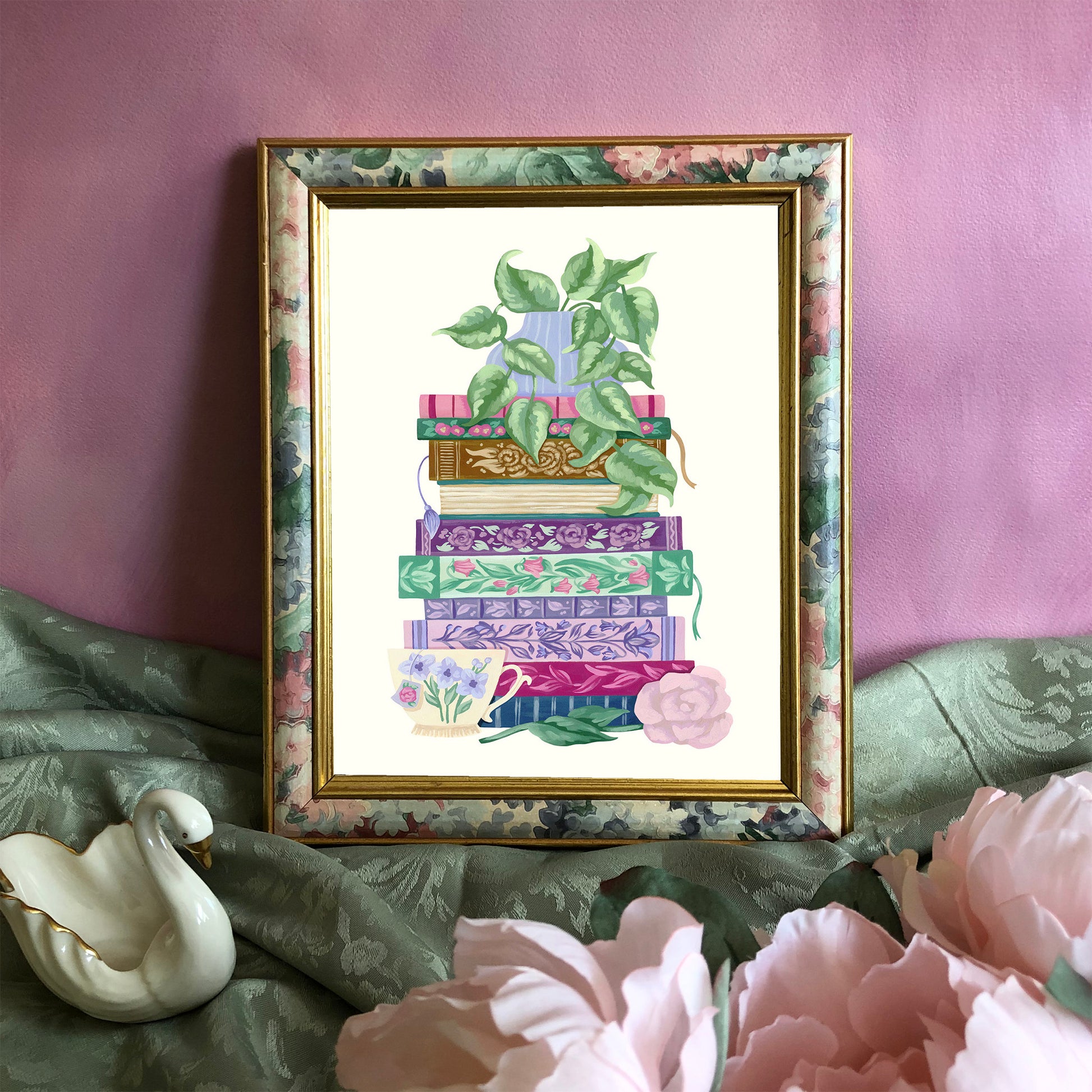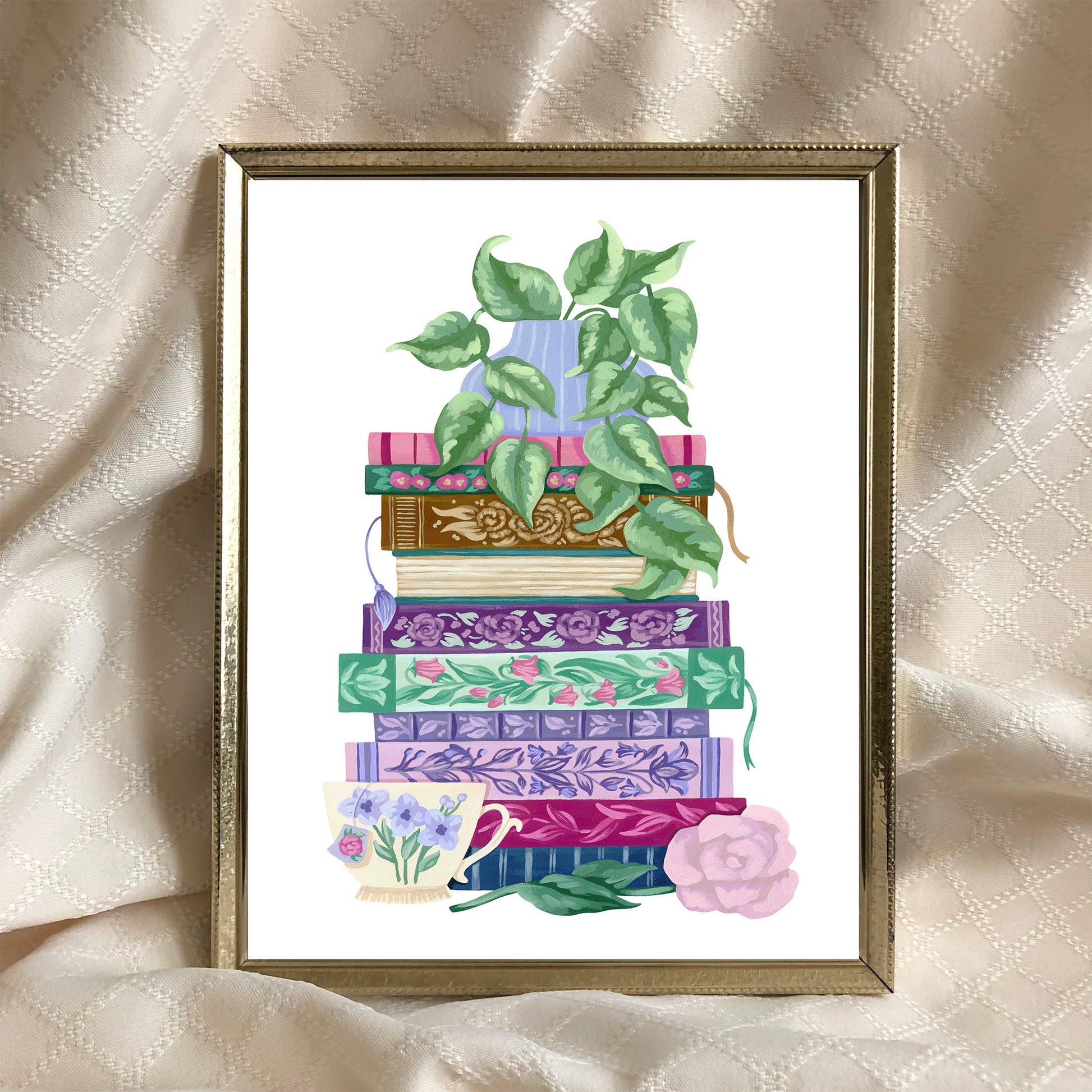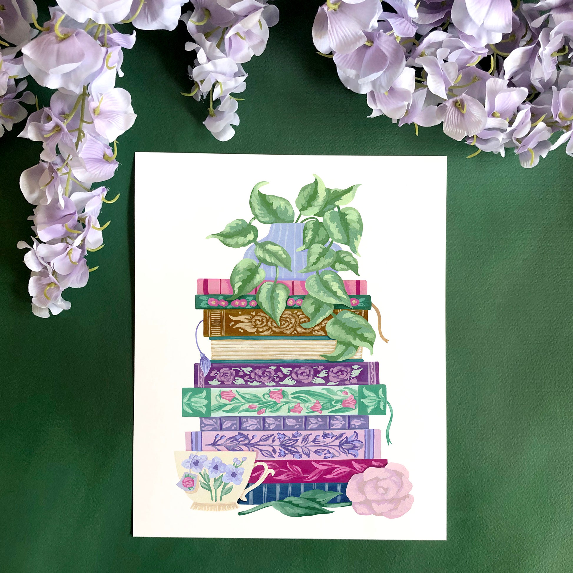 This floral stack of books art print features an original design by artist Mia Whittemore. A vase of trailing green leaves sits atop a stack of colorful and embellished books with a teacup and pink flower at the bottom. A perfect bookish gift for yourself or a friend!