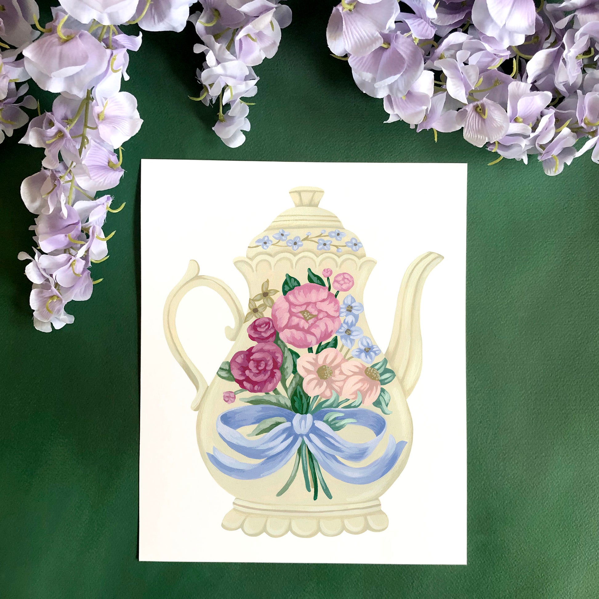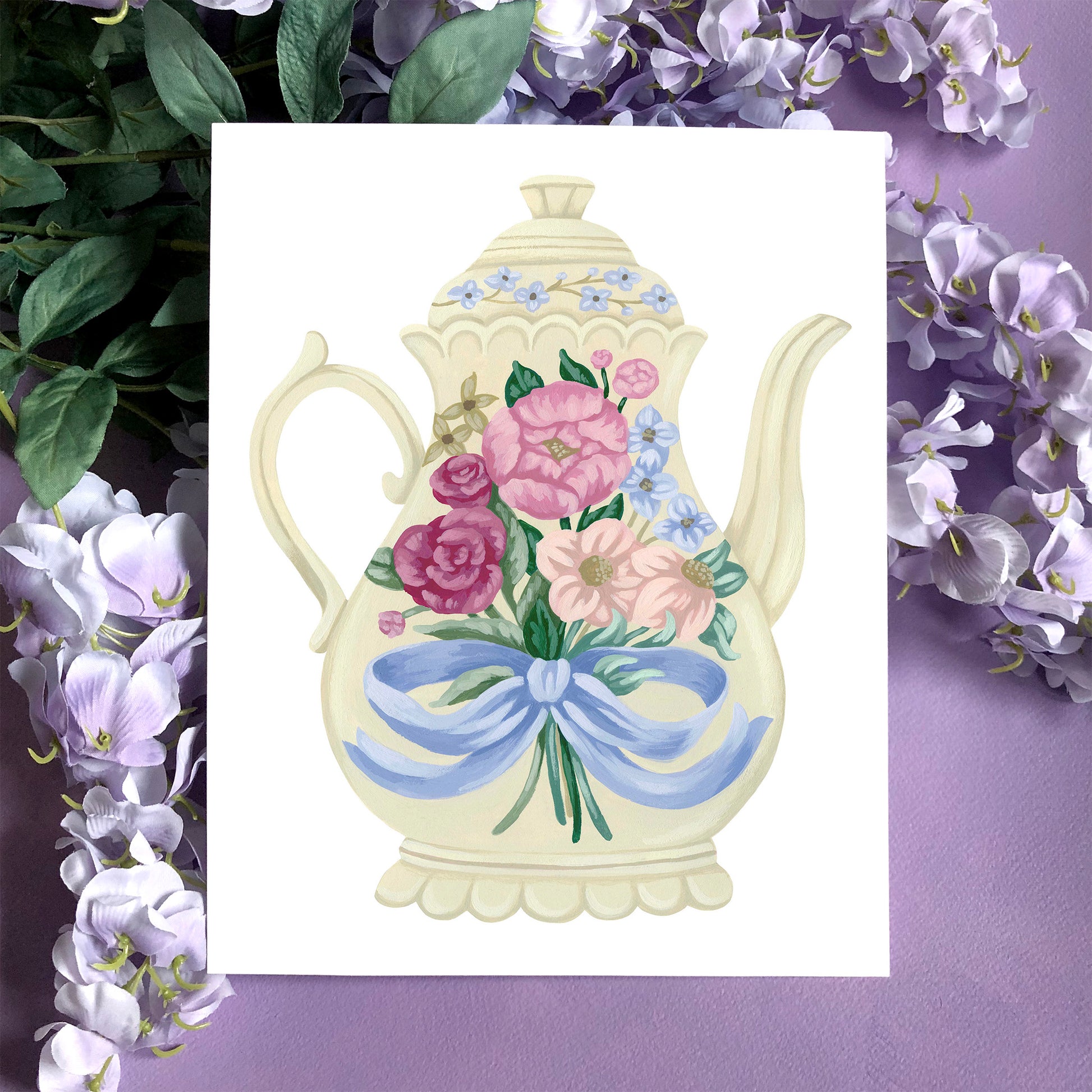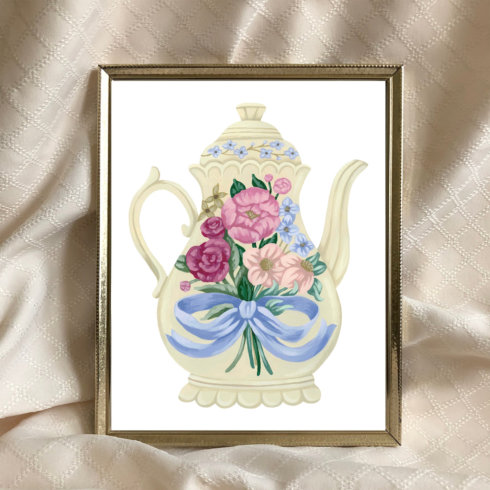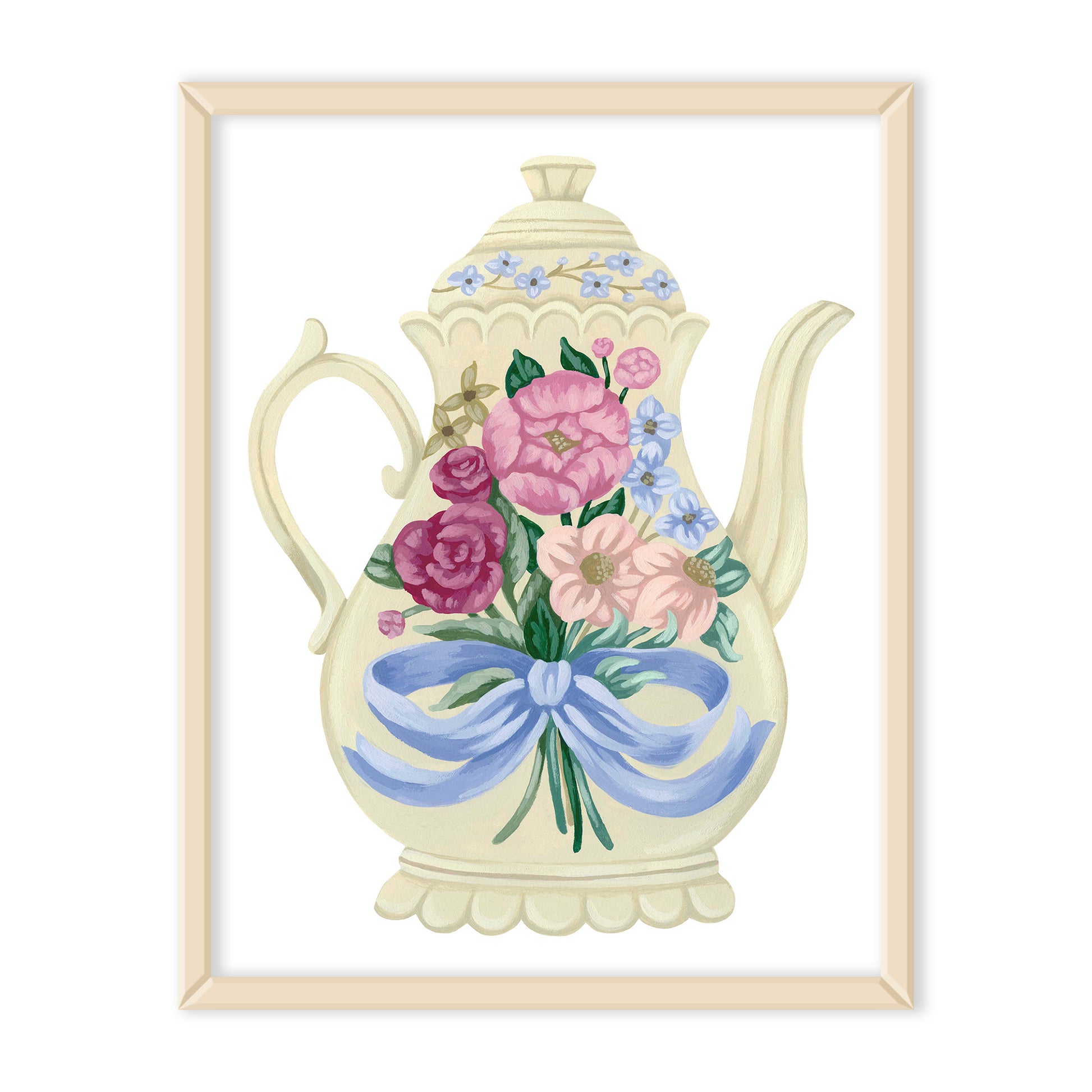 Add a coquette touch to your kitchen with this vintage-inspired floral teapot art print of an original painting by artist Mia Whittemore. This print features a cream colored teapot adorned with a colorful flower bouquet topped off by a blue bow.