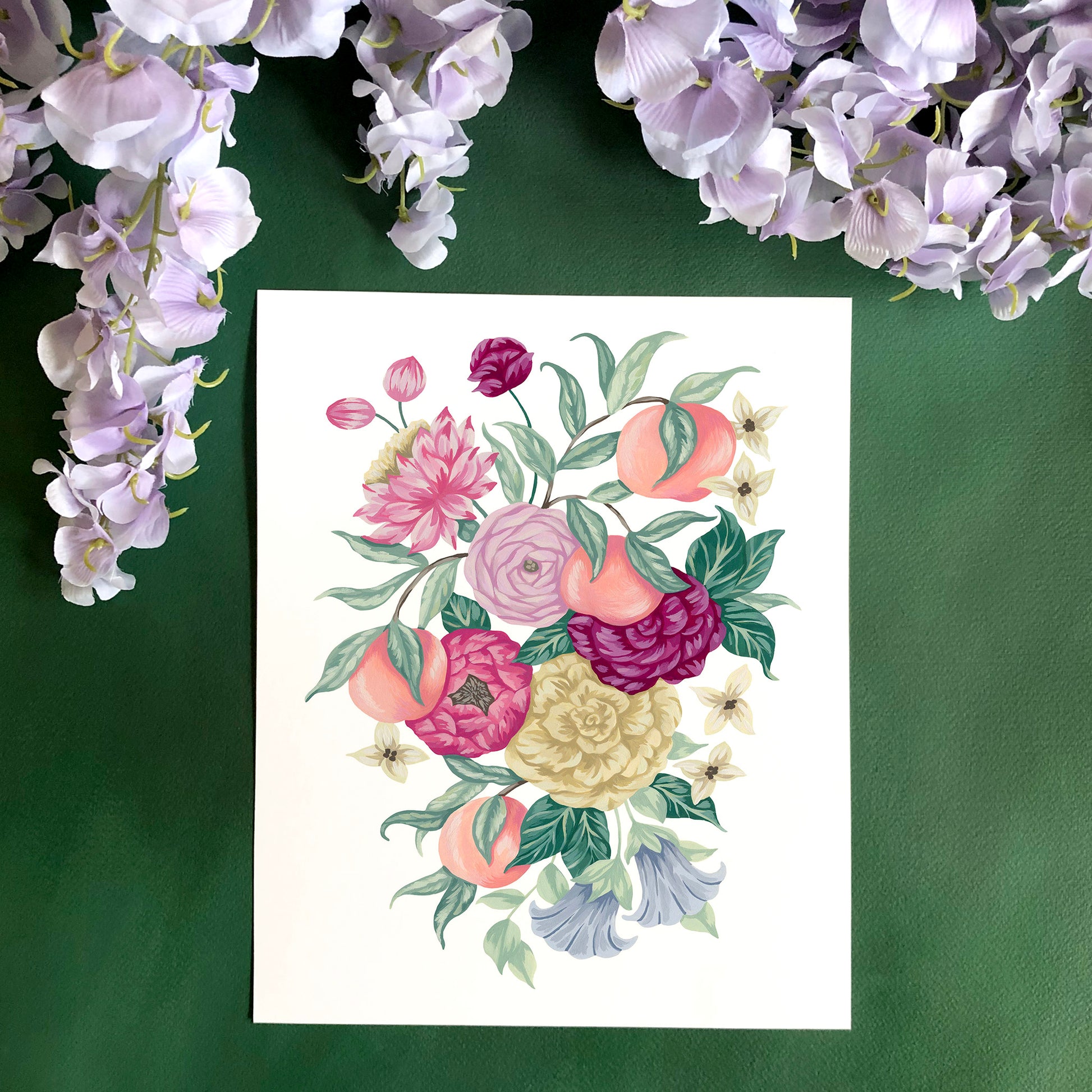 All of Mia's artwork begins as a painting on paper, such as this peach artwork originally painted in acrylic gouache. Mia draws much inspiration from vintage floral and botanical illustrations, therefore striving to create colorful and timeless pieces. After scanning and cleaning up her paintings, she then creates prints and products featuring her original designs.
